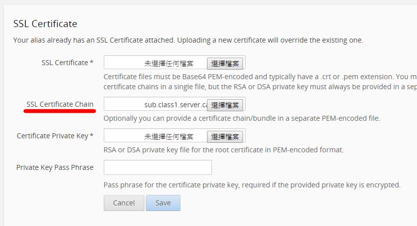 SSL Certificate選擇”Class 1 Intermediate Server CA”中間憑證,其餘分別選擇ssl.crt與dssl.key後保存