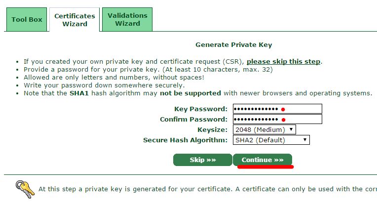 網路教學這裡多半採取Skip的方式,貼上自己生成的CSR來申請,但我們這次改由StartSSL生成.key