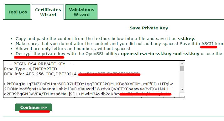 此時會生成Private Key,請複製到記事本或Notepad++以ASCII存檔成ssl.key,這份檔案無法直接安裝在伺服器,稍後需透過工具箱的”Decrypt Private Key”與前面輸入的”Password”轉換,妥善保存檔案後請繼續完成後續SSL申請