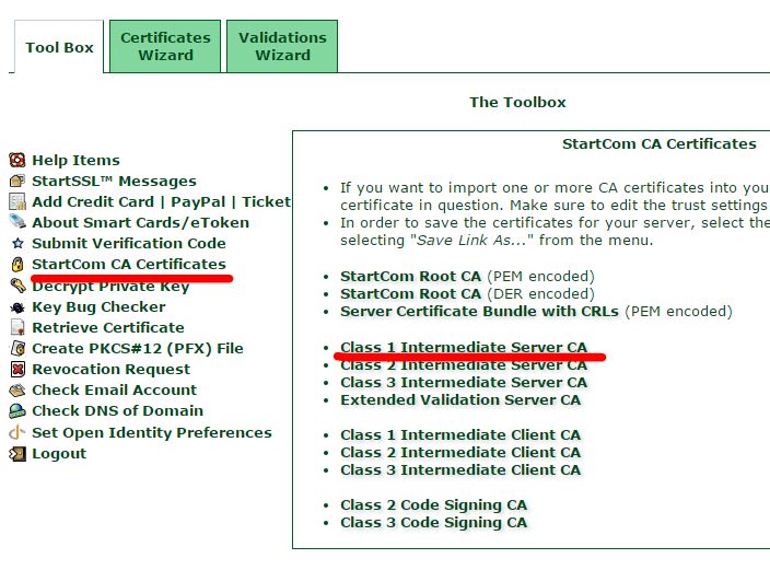 進入”Tool Box”,”StartCom CA Certificates”,下載”Class 1 Intermediate Server CA”中間憑證