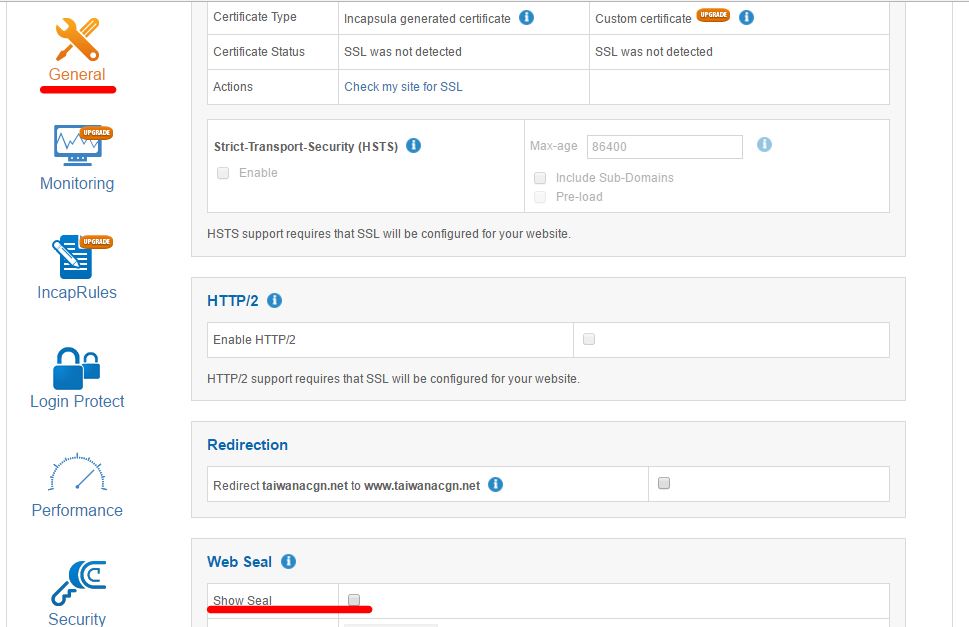 點選General取消Web Seal(否則網站將出現右下角的Incapsula圖示)