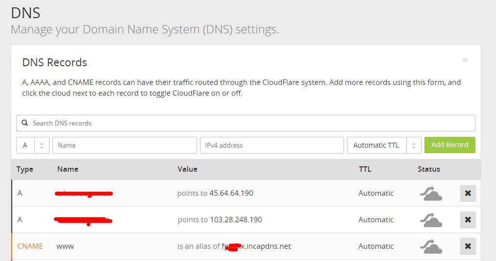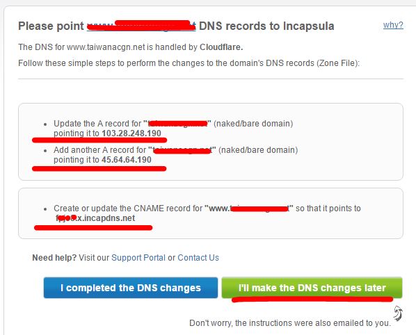 顯示Incapsula提供的站點A紀錄與CNAME紀錄