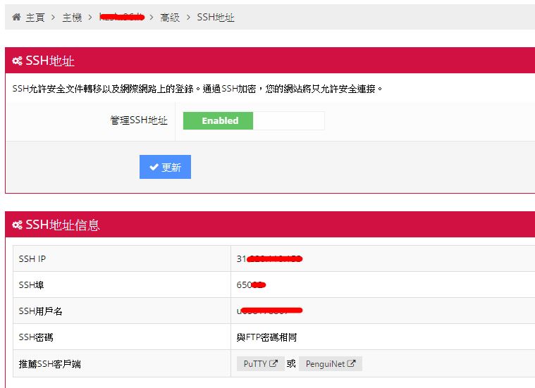開啟SSH後按下更新完成配置,並留意下方顯示的SSH連接資訊。